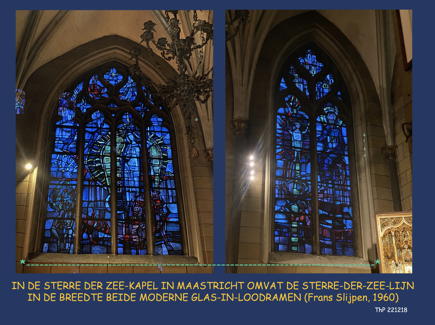 Op zoek naar mogelijke versleutelingen van het Energielijnenpatroon van de Onze Lieve Vrouwebasiliek bestudeer ik via de gesloten glazen deuren de ramen in de Sterre der Zeekapel. Wie heeft de inhoud bedacht? Hoe vrij is de ontwerper geweest? In het hele proces is vast een moment van ontwerp-goedkeuring geweest.
