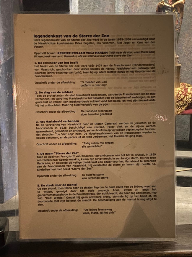 In het noordertransept, oostelijk van de biechtstoel met Michaël en de Draak, probeer ik alsnog een tweede Lijn horend bij de twintig-stappen-brede Energielijn te traceren, maar tref er geen enkele Lijn aan. Langs de noordwand hangt een vitrine met een diorama waarin Marialegenden, verbonden aan het beeld van de Sterre der Zee, lieflijk worden uitgebeeld. Welke kernen van waarheid zouden erin zitten? Nadat ik het A4-tje heb gelezen en gefotografeerd, ga ik verder. Oh, in 2025 hangt die legendenkast niet meer in het Noordertransept. De tijd brengt veranderingen teweeg, de legenden wil ik nog even in ere houden.