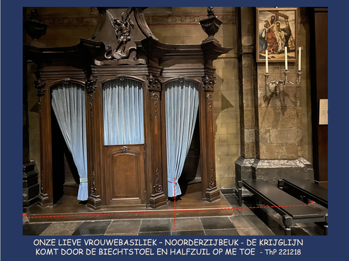Binnen de Energielijngrenzen bevindt zich een biechtstoel versierd met Aartsengel Michaël staand bovenop - en dus gedragen door - een Draak. De Draak verbeeldt niemand anders dan Aartsengel Lucifer, die door zijn aan de dag gelegde hoogmoed uit de Hemel is verdreven. De halfzuil oostelijk van de biechtstoel (links van de deur naar de kruisgang) bevindt zich bijna geheel op de tien-stappen-brede Energielijn en de kruiswegstatie 'De afneming van Jezus van het Kruis' op die halfzuil dus ook. Ik bestudeer de kruiswegstatie maar kan er niks vreemds aan ontdekken. Nee, geen versleuteling.